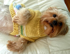 This is a pattern that’s already quite elaborate, but you can dress it up even more. I didn’t start knitting in the round until after the neck ribbing so I could leave that open and add a small button and loop to help with getting the sweater over puppy’s head. I’ll also line the neck of the new sweater to prevent stretching as it is worn over time. You can use a seasonal fabric or even a wide piece of ribbon or seam binding to line the neck. Make a facing, just as you would when you’re sewing a garment, press the edges under, and tack it to the inside of the neckline. A piece of ready-made lace trim peeking over the top would be lovely, especially for a little girl dog.